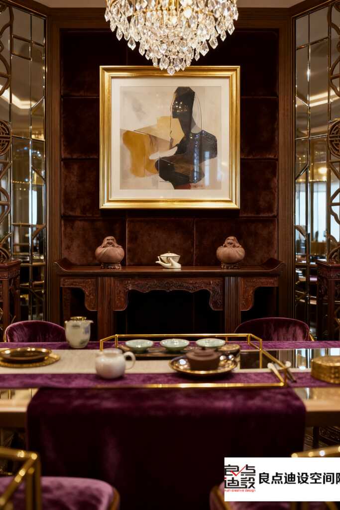 一進(jìn)門,整個空間的基調(diào)就被定下了。深色實(shí)木桌椅是骨架,穩(wěn)得住場子。但妙就妙在,設(shè)計(jì)師給每把椅子都“穿”上了酒紅色的絲絨坐墊!絕不絕?木質(zhì)的中式感還在,但絲絨的貴氣和慵懶感一下子漫出來了,坐上去感覺不是來喝茶,是來談一場風(fēng)花雪月的。