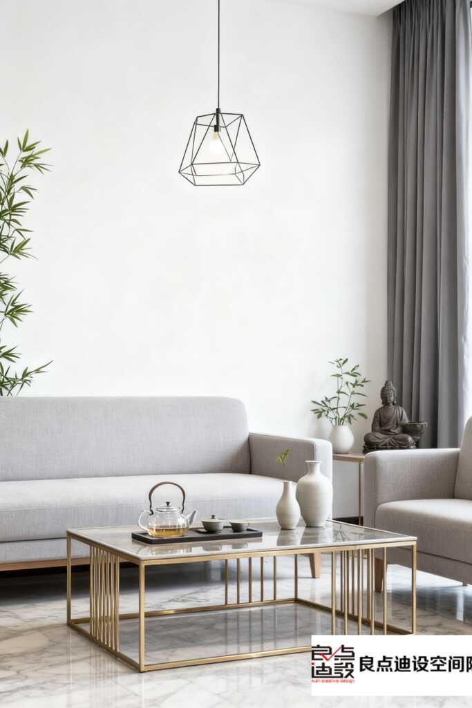 咱們聚焦細節(jié)哈。畫面C位是淺灰色布藝沙發(fā)配實木茶幾,搭配得那叫一個清爽。沙發(fā)線條利落,沒有多余雕飾,但質(zhì)感一眼就能看出來;茶幾的木紋自然質(zhì)樸,一下子就把中式韻味帶出來了。這種簡約處理特別顯大氣,比堆砌傳統(tǒng)雕花家具更符合現(xiàn)代審美,耐看又不失格調(diào)。旁邊墻上掛的那幅黑白幾何線條裝飾畫,簡直是點睛之筆!黑白配色打破沉悶,幾何線條又給空間注入了藝術(shù)感,讓禪意不止于古樸,多了幾分當代氣息。