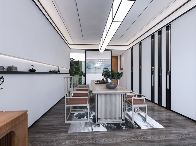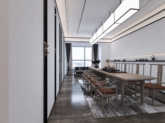 大面積落地玻璃將自然光引入室內,使得室內寬敞明亮,使用局部燈光照明,視覺效果上增加了空間的層次感。干練的硬裝彰顯豪邁的氣派,白凈優雅的軟裝則體現極簡的中國風茶室。