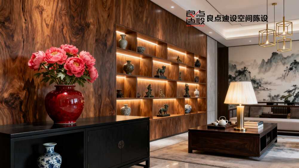 墻上內嵌的多寶閣才是靈魂!每個格子都藏著寶貝:青花瓷瓶、紫砂茶寵、線裝古籍…燈光從格子里透出來,每件器物都像在講故事。文化氛圍這不就來了?