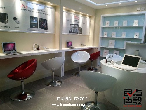 本Apple專(zhuān)營(yíng)店背景色是地面的灰色和墻面的白色,配以原木色和亮銀色家具,點(diǎn)綴上高貴的具有科技感的炫色個(gè)性座椅,整個(gè)空間色彩搭配明快高調(diào),凸顯Apple高級(jí)、尊貴與時(shí)尚。