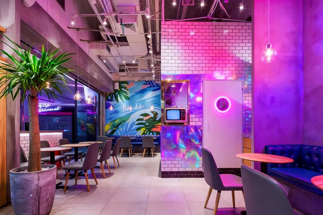 家人們,你們有沒有遇到過那種一走進去就忍不住掏手機的餐廳?今天咱就來扒一扒這家憑軟裝直接封神的網紅店!說真的,光是那面墻就夠你拍九宮格了——紅橙黃綠藍的彩旗串成一排,上面印著“SALMON”“ALOHA”這種自帶度假感的英文詞,再配上熱帶植物圖案,瞬間把你拉進夏威夷海灘模式。背景是干凈到反光的白色瓷磚墻,深藍色皮質卡座往那兒一擺,高級感直接拉滿,懂的都懂這是出片神器啊!