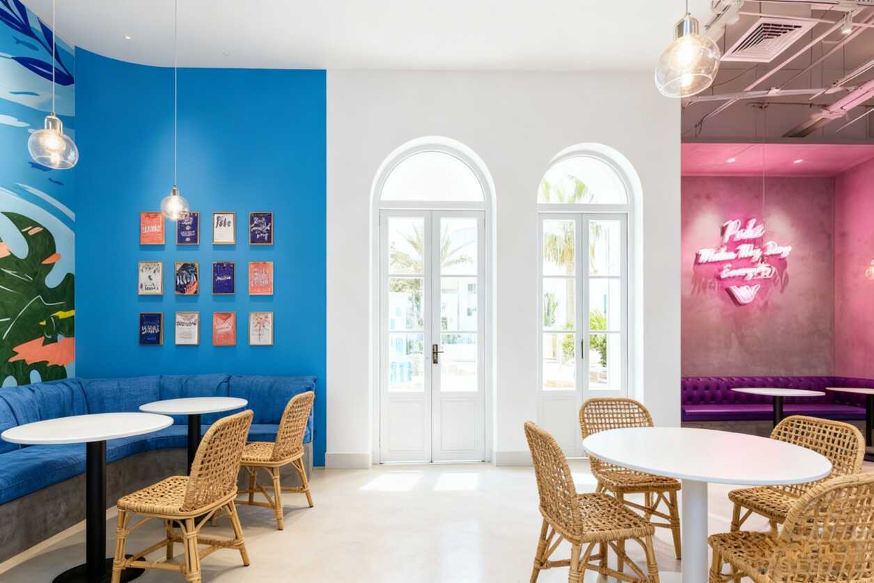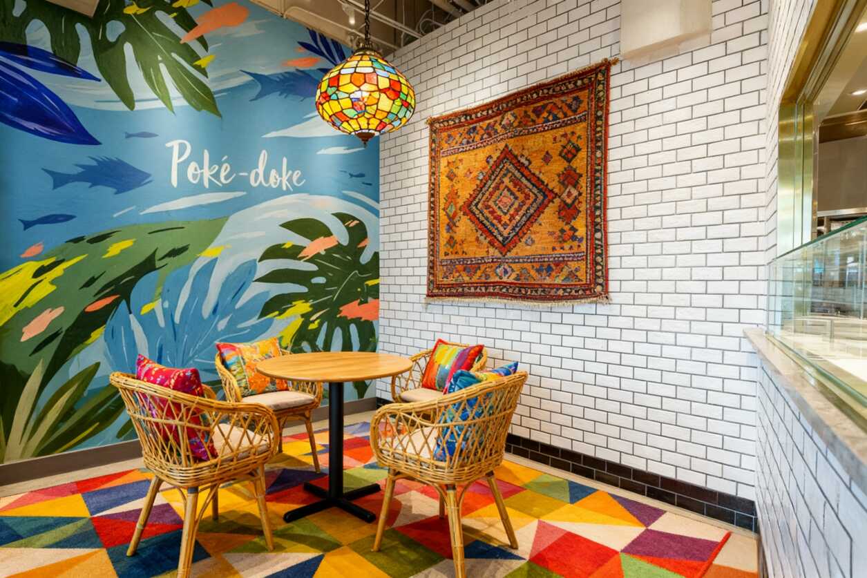 寶子們,這家專做波奇飯的“Poke-d”餐廳真是把我拿捏住了!一進門就被整面藍色主題墻吸住眼球——翠綠棕櫚葉+躍動大魚圖案直接帶你瞬移夏威夷海邊,中間那個“Poke-d”logo設計得賊有辨識度,海洋氛圍拉滿不說,拍照當背景板簡直一絕!