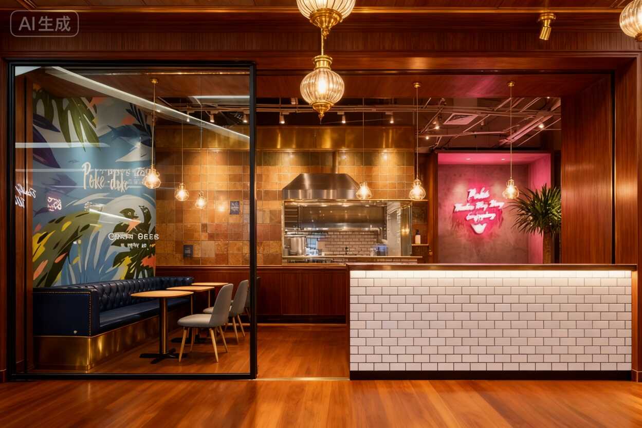 寶子們!今天刷到這家餐廳的軟裝設計,真的被驚艷到了!白瓷磚墻上掛滿彩色卡片的設計太絕了——"SALMON""ALOHA"字樣和棕櫚樹圖案隨風擺動,瞬間把你拉到夏威夷海邊。深藍色卡座配木質圓桌,色彩碰撞恰到好處,復古球形燈泡一照,整個空間彌漫著度假般的松弛感!