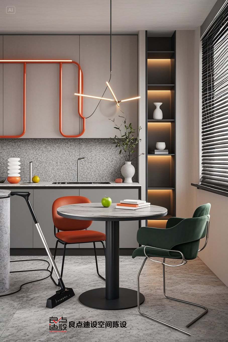 就看圖里這個地方,是不是一眼就被那個獨特的吊燈吸引了?這環形的設計,暖黃色的光一打,氛圍感直接拉滿有沒有!柔和的光線不僅能給空間增添溫馨感,還超適合晚上在這兒小酌一杯或者看看書呢。