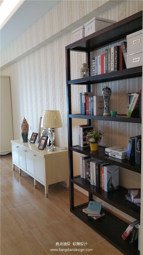 空間軟裝色彩:深胡桃木色 乳白色、淡藍色