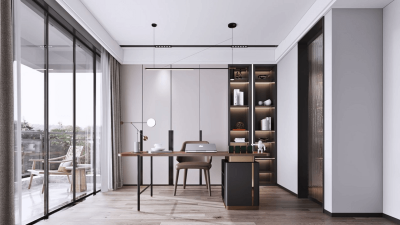 或者只作為獨立書房時需要規(guī)劃足夠的收納空間,靠墻定制書桌+書柜,可容納多人使用,便于工作學(xué)習(xí)。開放式與封閉式并存的書柜,既可以擺放書籍,也可以擺放裝飾品。