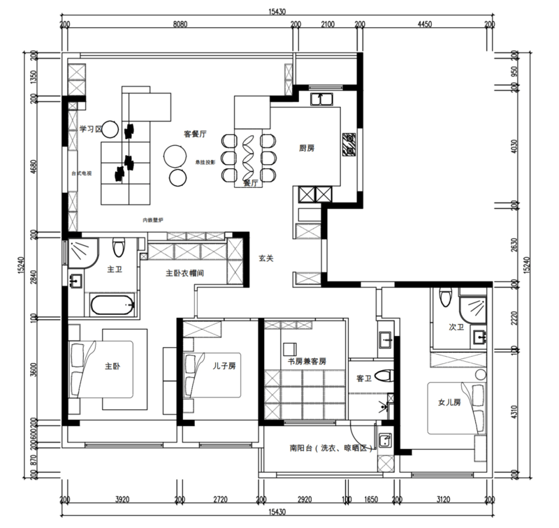 因為這個戶型南北都有陽臺所以南陽臺主要用作洗衣晾曬,北陽臺作為休閑區(qū),種種鮮花綠植等。四個房間均朝南,保留其中三間臥室均帶有飄窗,居住起來比較舒適,兩間作臥室套房,一間為主臥,另一間可以作為長輩房,使用起來更加方便;兒子房靠近書房,臥室比較小,只做基礎(chǔ)的收納和滿足睡眠需求,學(xué)習(xí)主要在書房完成,提高空間的使用頻率。