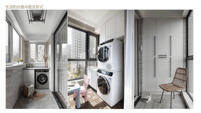 在生活陽臺上設(shè)計洗衣池,可以選一體式臺盆,帶三面擋水。遵循上烘下洗的原則,衣服拿出來就可以穿,減少晾曬時間。轉(zhuǎn)角的空間剛好收納家政工具,適當(dāng)利用洞洞板進行收納,更加整潔。